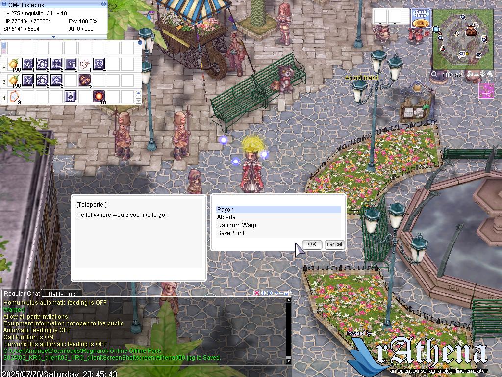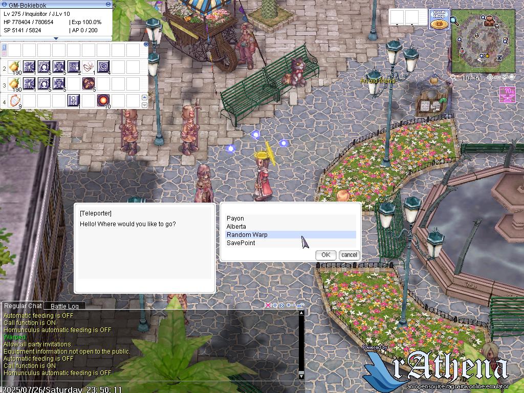 Payon: Warps the player to specific coordinates in Payon.Alberta: Warps the player to specific coordinates in Alberta.Random Warp: Warps the player to a random location on their current map (Prontera, in this case).SavePoint: Warps the player to their last saved spawn point.